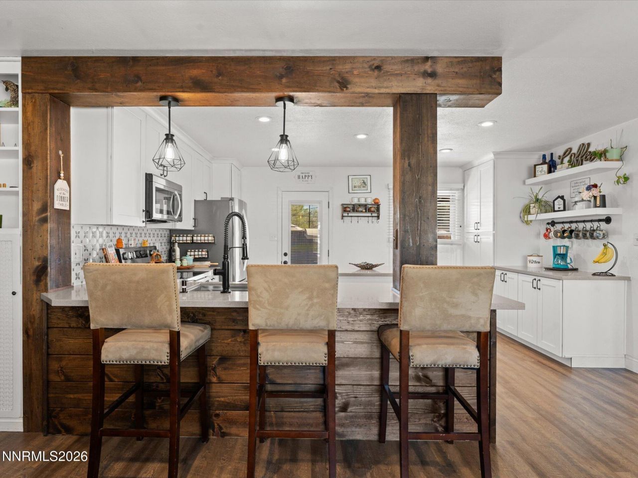 This beautifully updated home offers a thoughtfully redesigned layout and modern upgrades throughout. The seller completely transformed the kitchen by expanding the original footprint and opening up a wall to create a bright, open-concept space with additional seating. The kitchen now features a large center island for meal prep, a spacious breakfast bar, and even a dedicated coffee bar area. With abundant storage and generous counter space, this truly is a chef's kitchen-complete with all-new stainless steel appliances, including a range, refrigerator, dishwasher, and a modern single-basin sink accented by sleek matte black fixtures. The kitchen seamlessly flows into both the family room and a separate living room, highlighted by a charming wood-burning fireplace. This open great room design is ideal for entertaining and everyday living. The bathroom has been completely remodeled with a modern touch, featuring beautiful cabinetry, a farmhouse-style sink, and a tub/shower combo with custom tile work. Additional upgrades include new flooring installed in 2023, a recently installed water heater, and a new window A/C unit. The home also offers a separate laundry room equipped with a sink, cabinetry, and shelving for extra storage. Step outside to enjoy the newly added large concrete patio-perfect for entertaining or relaxing. The exterior has been fully updated with new siding, fresh paint, and new gutters. Need extra storage? This property includes a new 12x16 storage shed along with an additional utility shed. A new side yard fence was installed in 2025/2026, providing added privacy. Situated on an oversized corner lot, there is ample space for RV parking or additional vehicles. The roof was replaced in 2016. The seller's have invested over 72,000 dollars + labor updating their beautiful home with lots of love! Now you can sit back and enjoy all their hard work!! Refrigerator and washer/dryer are included.