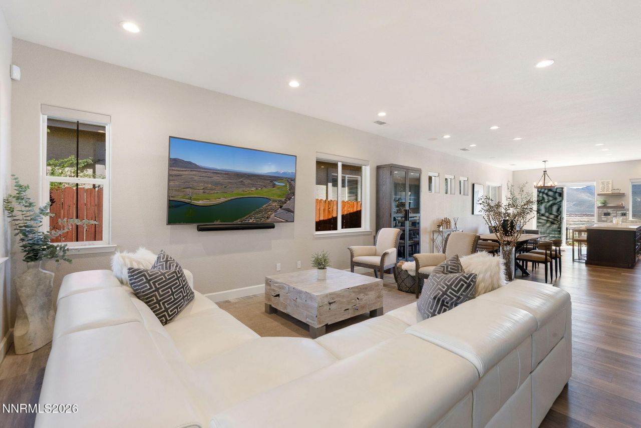 Enjoy sweeping golf course and hillside views from this beautifully upgraded 3-bedroom, 2-bath single-level home, ideally situated within the gated Sunridge Golf Course community of The Springs. Thoughtfully designed with an open-concept layout, the home features high ceilings and an abundance of natural light throughout. The chef's kitchen serves as the heart of the home, showcasing premium cabinetry, stainless steel appliances, and a spacious center island, perfect for both everyday living and effortless entertaining. The expansive living and dining areas flow seamlessly to a private patio, where unobstructed views of the fairway and tranquil pond create an exceptional setting for relaxation or hosting guests. The primary suite offers a true retreat, complete with spa-inspired amenities and picturesque views of the golf course and pond. Unwind in the soaking tub while taking in the serene surroundings. Located in one of Carson Valley's most desirable gated communities, this home offers peaceful golf course living with convenient access to Carson City, shopping, and dining. Reno and Lake Tahoe are just a short drive away, all while enjoying the tax advantages of Nevada living.